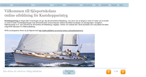 Gå Kustskepparintygtskurs online Kustskepparen är kursen för dig som vill bli en riktigt kompetent fritidsskeppare och få rätt att framföra fritidskepp. För dig som vill köra en fritidsbåt som är längre än 12 meter och bredare än 4 meter är Kustskepparen ett krav. Onlinekursen följer samma upplägg som i lektionssalen, men du läser i din egen takt - när du vill, var du vill. VIRTUELL UTBILDNING MED KONKRETA REDSKAP När du beställer kursen får du omedelbart en inloggning via mail som är aktiv i sex månader.Genom streamade videos får du följa med ut till havs, lära dig navigera och allt det andra du behöver för att ta ditt intyg. Böcker, sjökort och bestick skickas hem till dig (finns som tillägg vid bokning). Kursen följer Nämnden för båtlivsutbildnings krav och rekommendationer. Harald Treutiger guidar dig igenom kursen genom enkla och lärorika filmer (2-5 minuter långa), undervisning och interaktiva övningar. Kursen följer samma upplägg som läroboken ”Kurs & Bäring” som skickas hem till dig om du beställer den. Vi går igenom bl.a: missvisning och deviation, navigation utomskärs, Radar och AIS, lägesbestämning med hänsyn till dev och missvisning, lanternor, navigering med fyrar, nedsatt sikt, satellitnavigering, lagar och regler och mycket mer. Onlinekursen innehåller dessutom många interaktiva övningsfrågor och övningsprov. Du kan också komplettera onlinekursen med övningssjökort och bestick (dvs passare, transportör och linjal) samt kursboken Kurs och Bäring upplaga 17 och/eller dagpraktikövning ombord på Sjösportskolans skolbåt När det är dags att skriva förhöret hjälper vi dig gärna att hitta en förhörsförrättare.