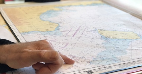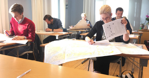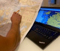 Kurslitteratur, övningsjökort, navigationsbestick.